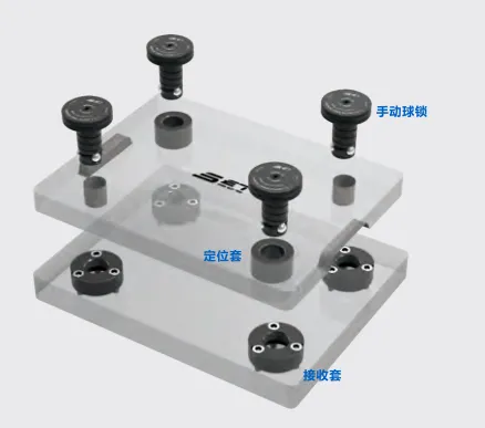 Hoofdcomponenten: ontvang van huls (geplaatst in de basisplaat), positioneringsmouw (geplaatst in de lade) handmatige kogelvergrendeling